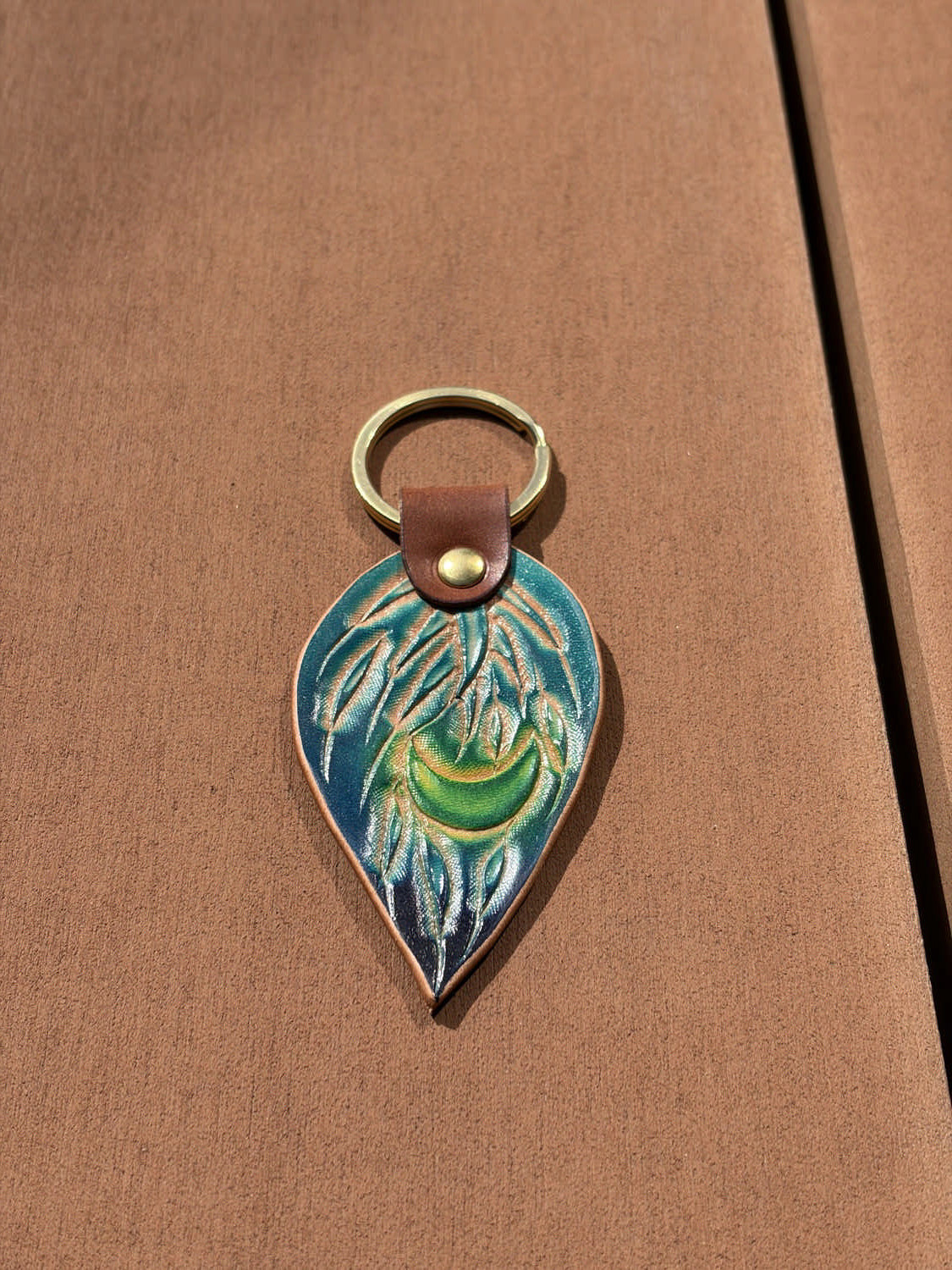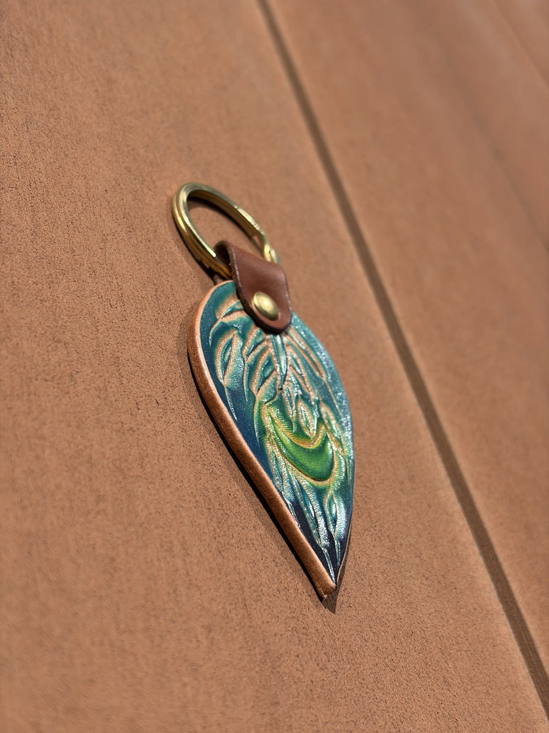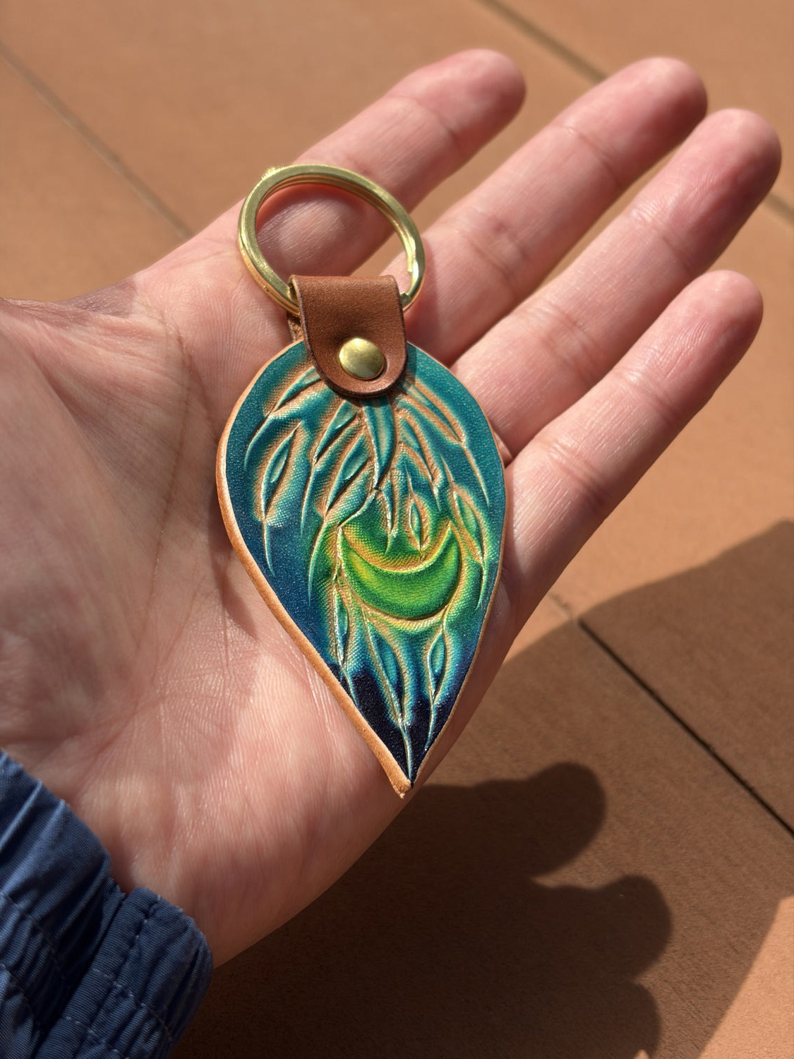 水面の揺らぎを思わせる青のグラデーションを、手染めで革に落とし込みました。